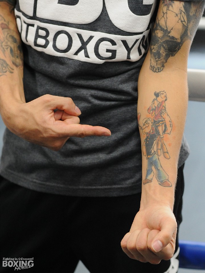 上半身には漫画や映画のキャラクターのタトゥーが多く、中でも左腕のポパイはブドラーに似ていることもあって報道陣が注目。自身はアマチュアでボクシングをやっていた父に似ていると話し、「僕もほうれん草を食べて強くなるよ」と笑いを誘った。