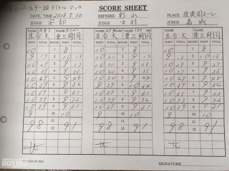 初回、挑戦者の東上が飛び込んで左フックを好打。大応援団の声援を背に果敢に攻めたが、末吉の右クロスを浴びて痛恨のダウンを喫した。末吉は2回以降、ジャブで組み立てると鋭いパンチで左目上を切り裂いた。リズムに乗った末吉は、その後もワンツーを連続でヒットさせ、さらに的確な左ボディでポイントを重ねた。前半終了時は49-45×2、50-44×1で末吉がリード。7回、劣勢の東上はガムシャラに前に出てパンチを振り回したが、末吉は冷静な試合運びでペースを渡さなかった。10回、勝利への執念を見せる東上は、強引に前に出ると末吉も真っ向から打ち合い試合終了のゴングを聞いた。採点は3者ともに7ポイント差で末吉を支持し2度目の防衛に成功した。