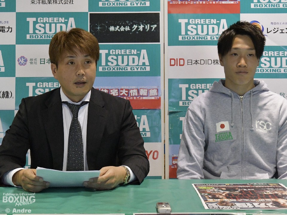 会見の冒頭、本石昌也会長は「前田は神戸第一高校から大阪商業大学に進みグリーンツダジムに来ました。私にとっても期待の選手。4月に同門の矢田良太がタイトルを獲ってくれたのでその勢いに乗っていきたい」と自信を見せた。