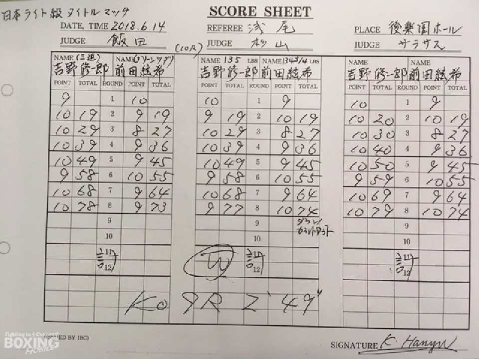 試合は挑戦者の前田がジャブを突き距離を測ったが、吉野は冷静な試合運びを見せると、3回からプレスをかけて攻勢。上下にパンチを打ち込み右ストレートで先制のダウンを奪った。ピンチを迎えた前田だったが、この後は粘り強く戦い手数を出した。前半終了時の公開採点は49-45×2、50-45×1で吉野がリード。6回になると吉野がさらに圧力を強めて左フック、右ストレートをねじ込み顔を弾いたが、前田も懸命にパンチを返す。しかし9回、吉野は右ストレートから返しのジャブで2度目のダウンを演出。ここも立ち上がった前田だったが、ダメージが深くカウントアウトされた。