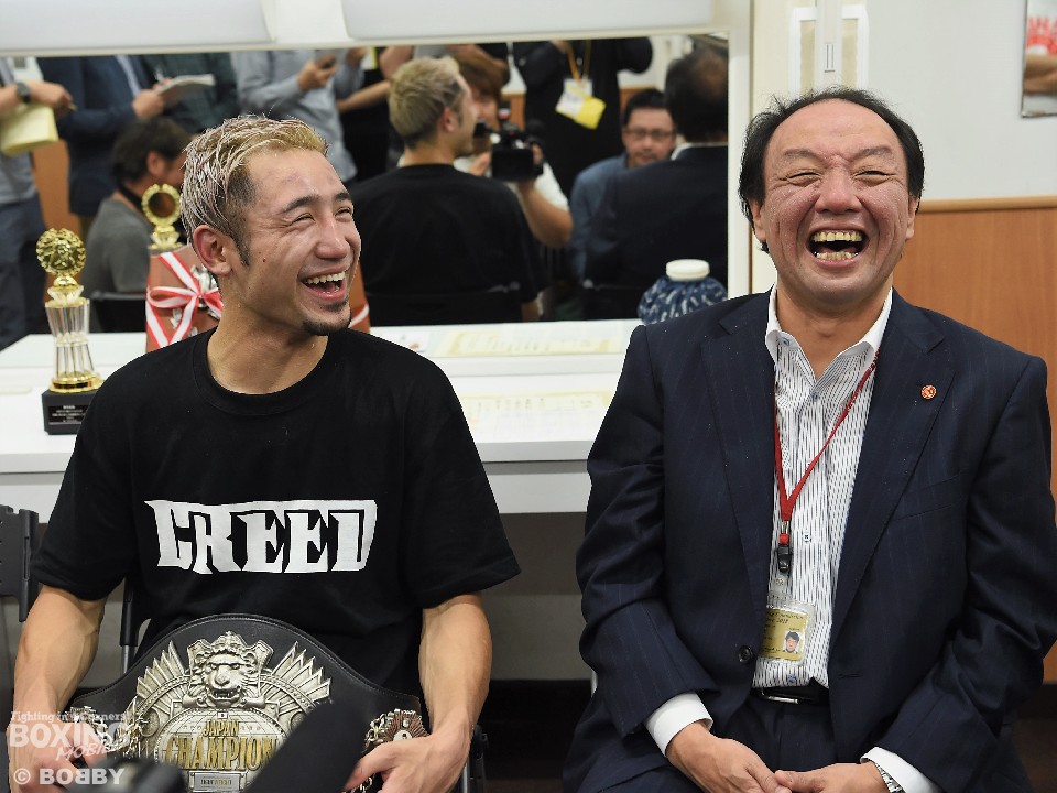 会見に同席した三迫貴志会長は「KOを狙い過ぎて動きが硬くなってしまった。相手はタフだったし、気持ちが強くアッパレな挑戦者だった。ただ、最後はしっかり倒したところはさすがだった。修正点はあるが、良い経験になった」。「今後も防衛を重ねてキャリアを積ませたい。米国でも練習させたい」と語った。