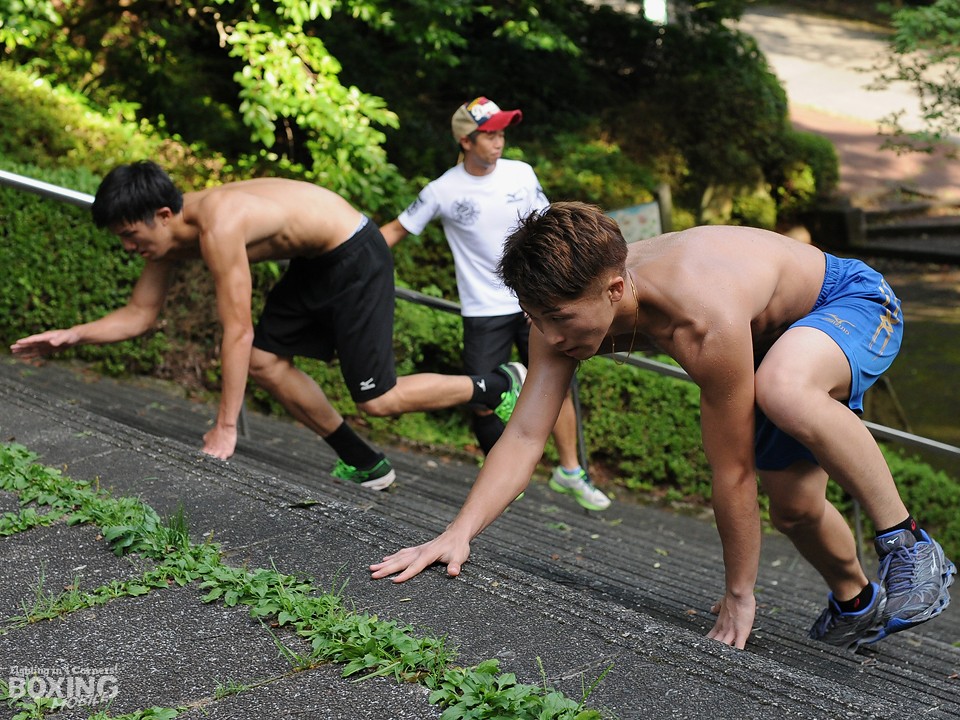 この暑さだけにオーバーワークは禁物だが、井上は「すべては気合い。もうダメだと思ったらダメ」と平成生まれらしからぬ発言。水分補給に気を使ったうえで、フィジカルトレーナーの高村淳也氏の指導のもと、100段の階段ダッシュから始まり、手押し車、階段ジャンプ、階段坂道を約6km走破と、下半身をいじめ抜くメニューを消化した。明日からはさらに階段、坂道の距離を伸ばし、早朝のビーチランも組み込む予定だ。