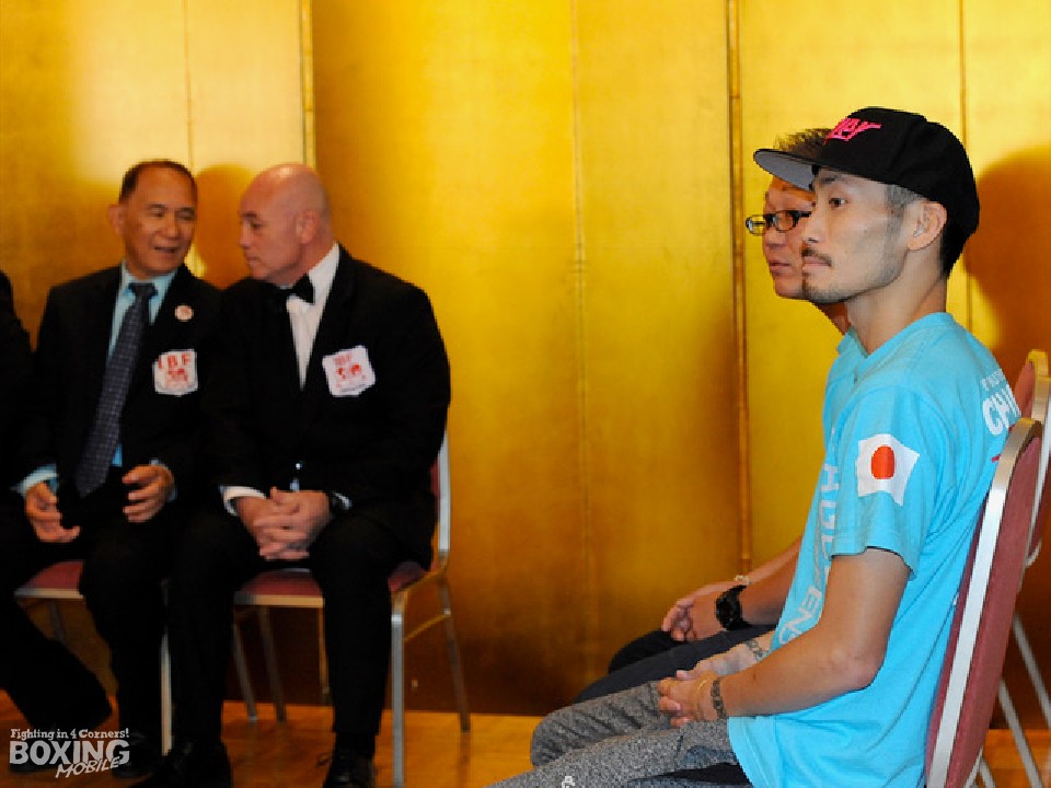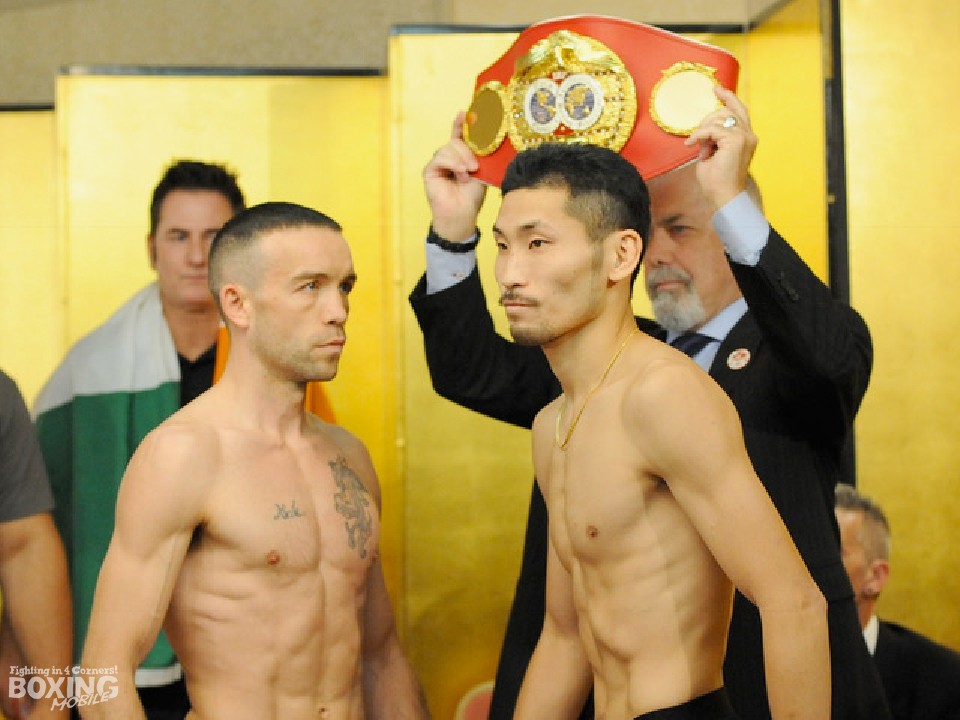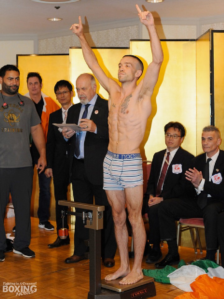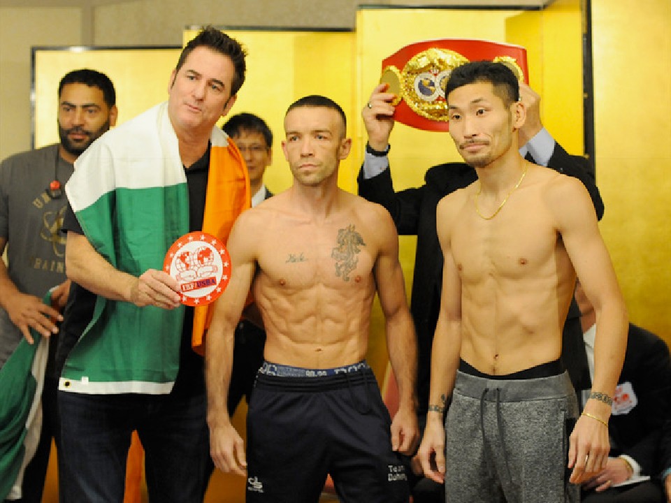 一方、これが世界初挑戦のドヘニーはリミットちょうどの55.3kgでクリアした。計量後に約10秒間のフェイスオフの後、岩佐が目をそらした後も睨み続けていた。「100%の自信を持っている。たくさんの応援が来るので力になる。明日は新王者になる」と気を吐いた。明日はさらにオーストラリアとアイルランドから約120人の応援団が来日し、ドヘニーの雄姿を見届ける。