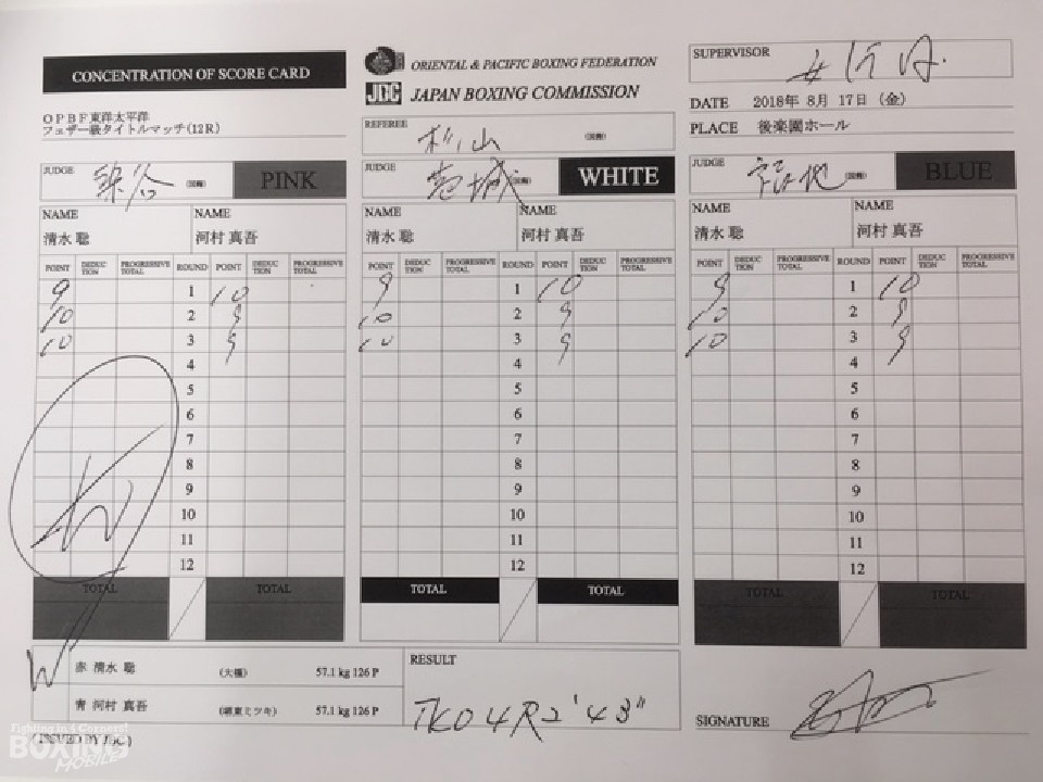 サウスポー同士の試合は、前半勝負を公言していた挑戦者の河村が積極的に攻撃を仕掛けると、左ストレートで顔をのけぞらせた。2回、清水はプレスをかけて固いパンチをコツコツ当てていくと、河村の左目下がみるみるうちに腫れ出した。4回、清水は前に出てきた相手に左カウンターを決めてダウンを演出。立ち上がったところに左ボディから連打でストップを呼び込んだ。