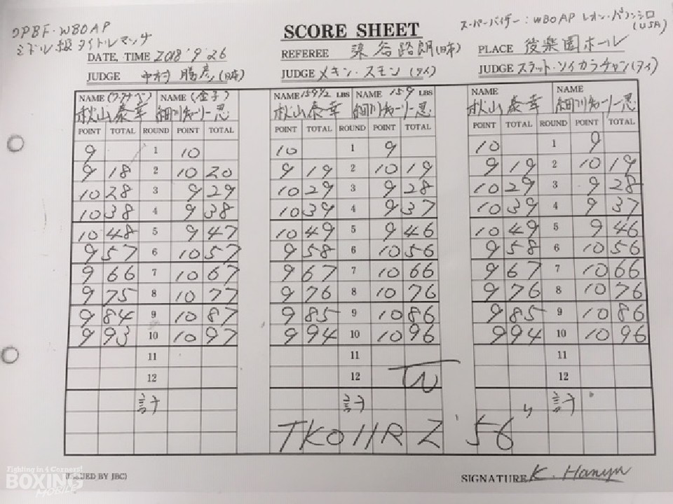 OPBF東洋太平洋&WBOアジアパシフィック・ミドル級タイトルマッチが26日に後楽園ホールで開催された「ゴールデンチャイルド.124」のメインイベントで行われ、2冠王者の秋山泰幸(ワタナベ)と挑戦者でOPBF11位、WBOアジア5位の細川チャーリー忍(金子)が王座を争った。両者は昨年3月に対戦し、この時は秋山が判定2-0で勝利。1年半ぶりの再戦は2回に試合が動いた。