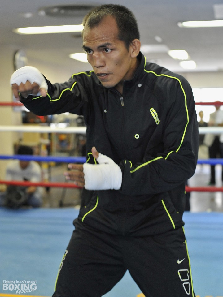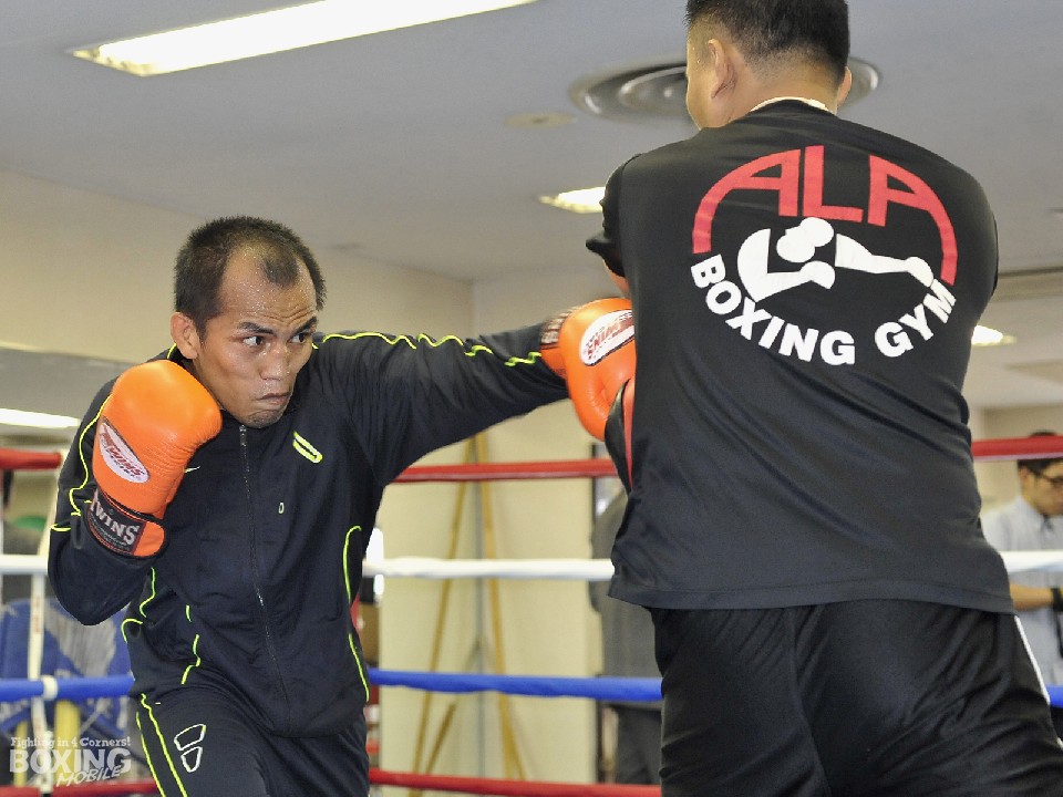 会見後はシャドー、ミット打ち、サンドバッグと軽めの練習を行い、早々に切り上げたメリンドだが、ミット打ちでは頻繁に左にスイッチし、偵察に訪れた敵陣営に心理面で揺さぶりをかけた。拳四朗の父・寺地永会長は「確かに田口戦ではスイッチをしていたが」と戸惑いを見せたが、すぐに「拳も前回(ガニガン・ロペス戦)で左対策はやってきたので問題はない。入念にやっているところ見られただけでも収穫」と話し、「リーチは拳の方が上。強いジャブで下がらせていきたい」とイメージしていた。