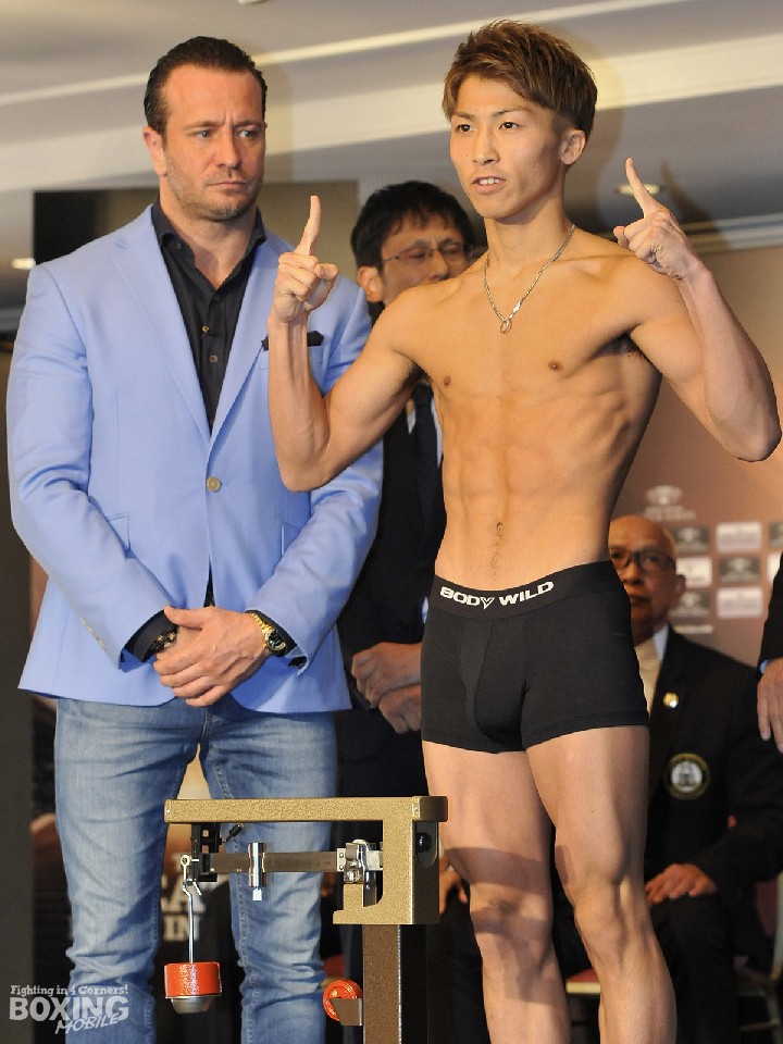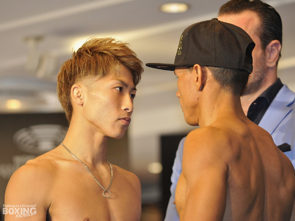 バンタム級転向2戦目との井上は、リミットちょうどの53.5kgでクリア。計量後に囲み取材に応じた井上は、「海外の計量の雰囲気に似ていたが準備することは同じ。相手を見たがしっかり仕上げてきているなと思った。明日はミスをした方がやられる試合になるので集中して戦いたい」。「ここ最近でモチベーションが高い。明日は試合を楽しんで最高の結果を出したい」と必勝を誓った。
