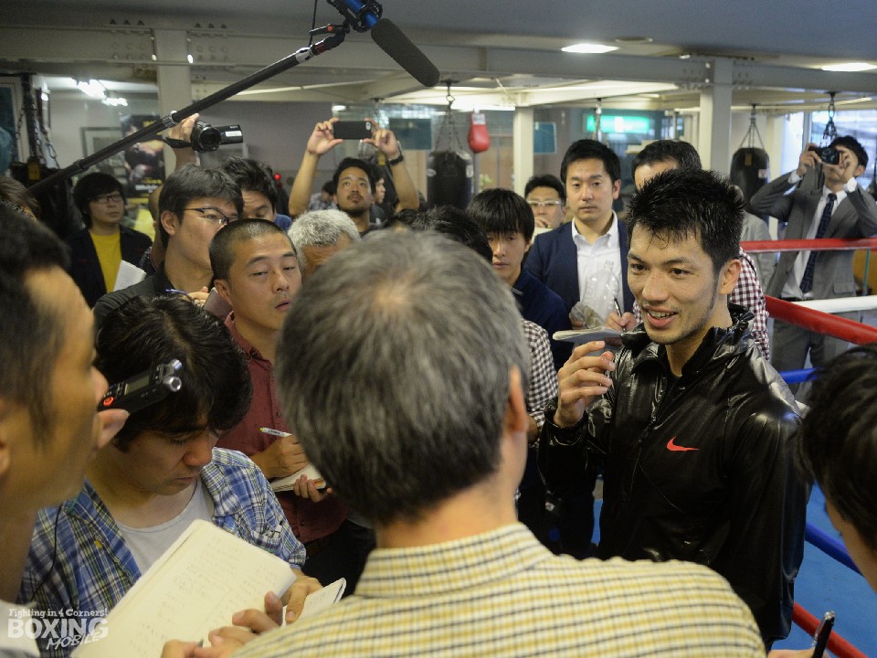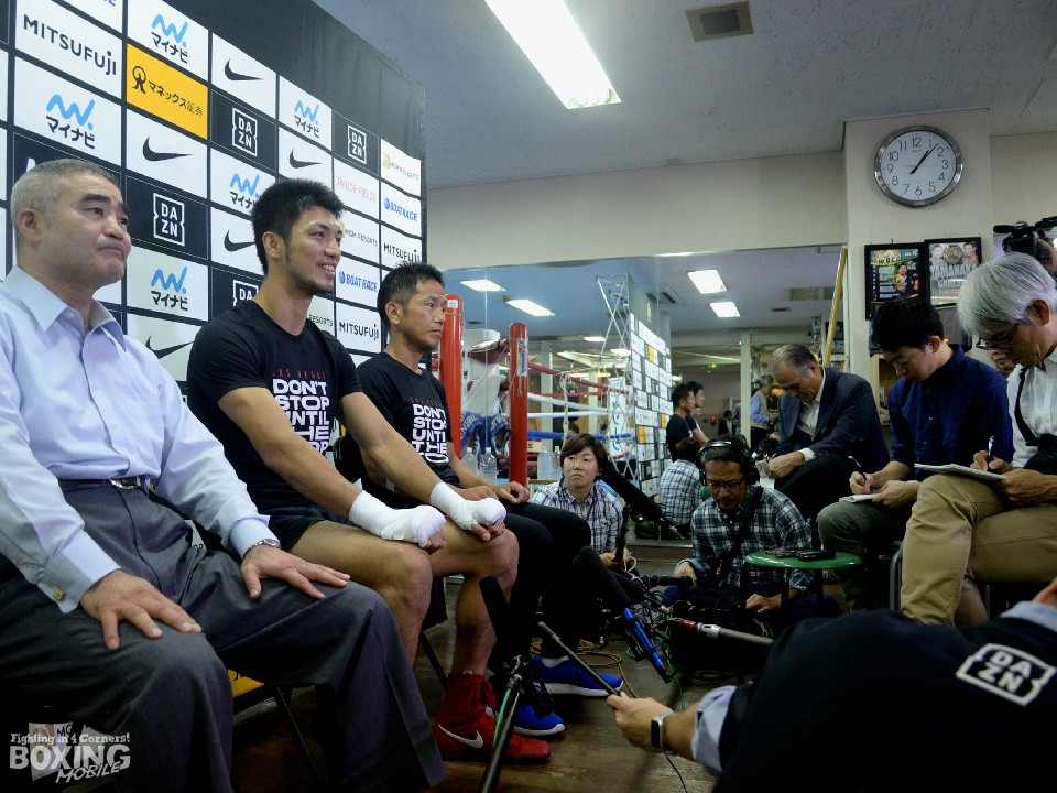 練習前の会見には、村田を浜田剛史・帝拳ジム代表と田中繊大トレーナーが両サイドに座る形で同席した。
