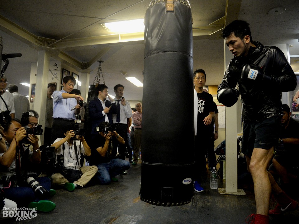 公開練習では柔軟体操からシャドーボクシングに移り、三浦広光との2ラウンドのスパーリング。お互いに力をセーブした最終調整といった様子で消化し、3ラウンドのミット打ち、3ラウンドのサンドバッグ打ちのあと、クールダウンのようにリラックスした縄跳びを終え、柔軟体操で終わらせた。