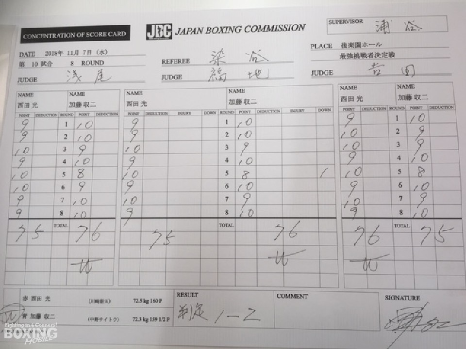 初回、サウスポー加藤が、ジャブを飛ばしながら左ストレートを好打し、懐に入りたい西田を突き離した。先手を取られた西田は、ボディをコツコツと当てて体力を削りにいくが、加藤の鋭いパンチを浴びた。4回、単発の左ボディを食らった加藤だが、忙しく動きながらワンツーをヒットしポイントを加点。西田も5回は圧力を強め、距離を詰めては左ボディを叩き、ラウンド終盤に右フックでダウンを奪った。失点した加藤は次の回の打撃戦に応じたが、西田の手数に押されてロープを背負う。最終8回は懸命にパンチを繰り出し試合終了のゴング。好勝負を演じた両者に惜しみない拍手が送られた。ジャッジに委ねられた採点は割れたが、2者の支持を得た加藤が接戦を制した。