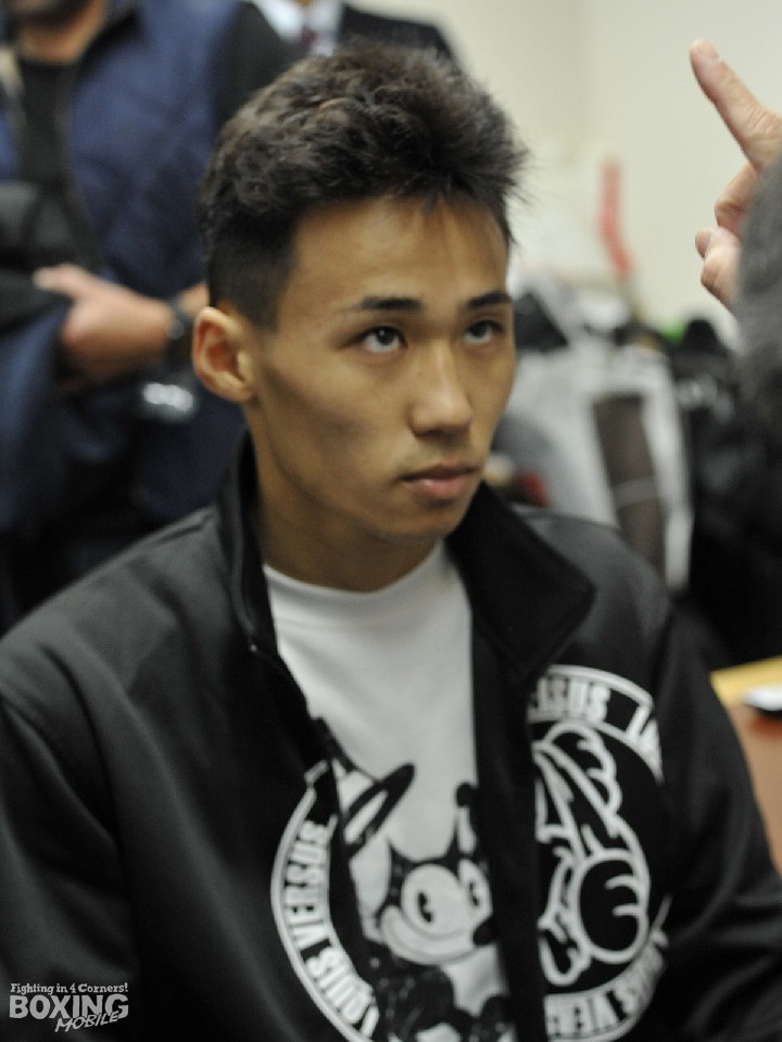 また、敵地に乗り込んだ井上は余裕の400gアンダーとパスすると、兵庫からの道のりが遠いとぼやきながらも、元気に「調子はめちゃめちゃ良い」とコンディションの良さをアピール。石澤について「顔がごつくて怖いが、思っていたより小さかった。でもスピードはありそう」と印象を話し、「初の6回戦だがスタミナは大丈夫だと思う。尼崎亀谷ジム初のタイトルを獲る。面白い試合にしたい」と抱負を語った。