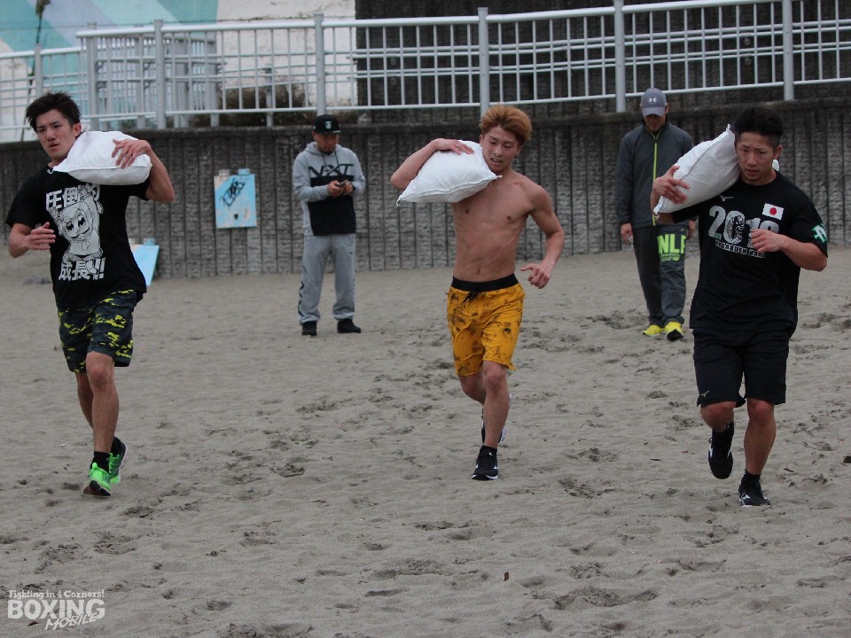 まずは800mを3分のペースで10本。1回走り終わるごとにタイムを速くするルールで走った。続いて砂浜ダッシュを5本、さらに今回から取り入れたという、1袋17kgの重さの土のうを担ぎ、砂浜ダッシュなど、約1時間のメニューをこなした。