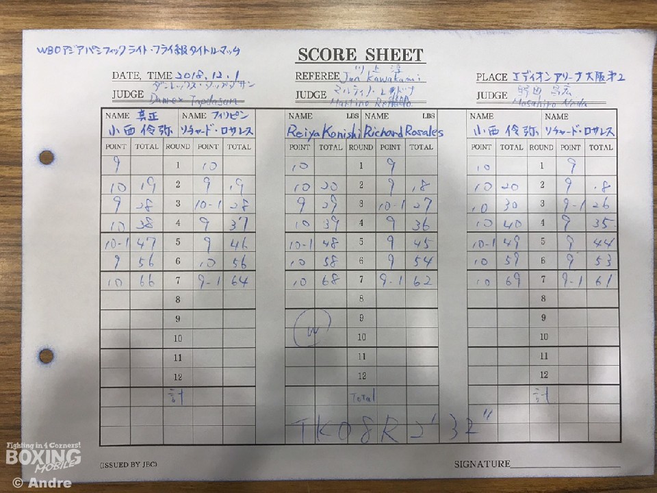 小西はロサレスのラフな攻撃をガードで回避すると左ボディ、右ストレートをヒット。ベルトと世界ランク奪取に闘志を燃やすロサレスは懸命にパンチを振り回すが、小西の有効打が上回った。しかし、次第に距離が噛み合わず荒れ模様になる。ロサレスは3回にオープンブロー、7回にホールディングの反則、小西は4回にローブローの反則でそれぞれ減点が課せられた。ロサレスの奮闘に手を焼いた小西だったが、7回に左フックから連打を浴びせると、ロサレス陣営からタオルが入った。