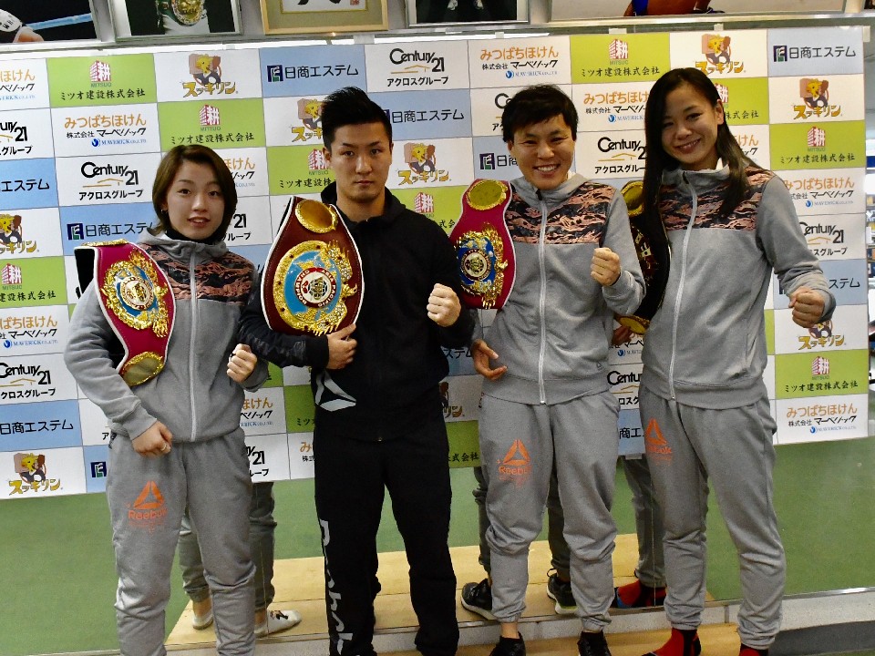 WBO女子世界ミニフライ級王者の多田悦子(真正)、WBOアジアパシフィック・ライトフライ級王者の小西伶弥(真正)、日本&OPBF東洋太平洋女子フェザー級王者の藤原芽子(真正)、WBOアジアパシフィック女子ミニフライ級王者の佐伯霞(真正)の4選手が12日、神戸市内の真正ジム事務所で試合から11日間、改めて勝利報告会見を行った。