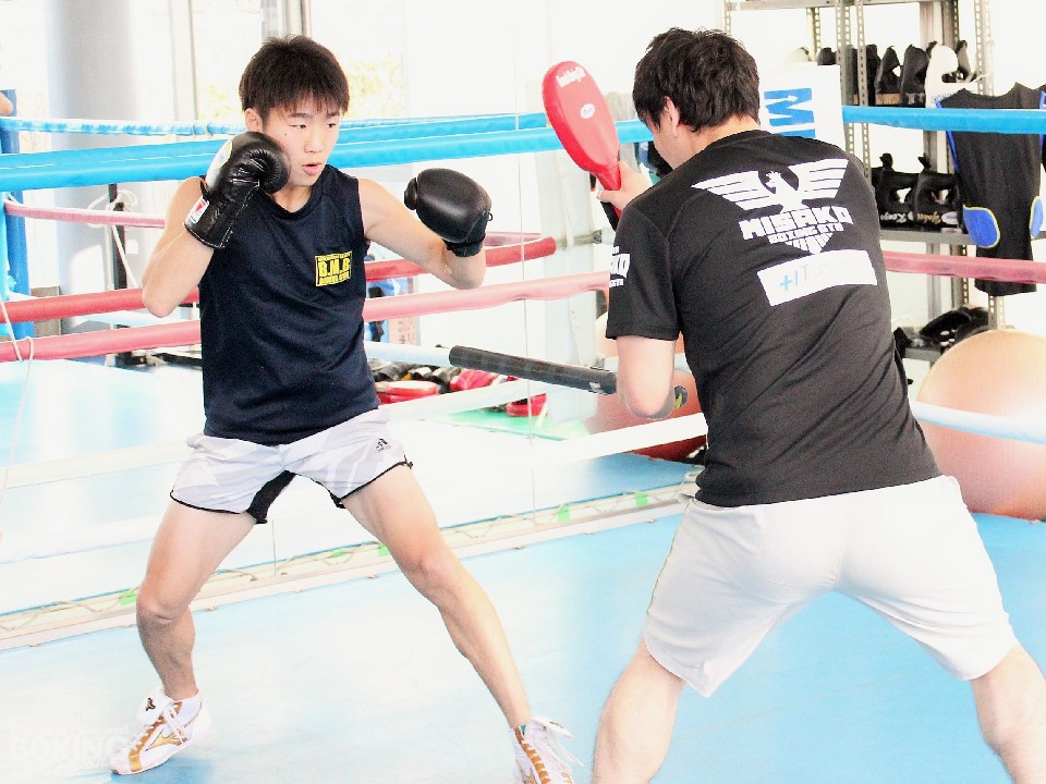 今年5月のガニガン・ロペス(メキシコ)戦の前からサウスポー対策として始めたトレーニングの効果で、距離を掴むのが早くなったと語った拳四朗。加藤健太トレーナーが持つスティックに当たらないよう距離を取りながらハンドミットにパンチを打ち込んだ。拳四朗は、「最近は初回で距離を掴めるようになり、自分のペースで戦えるようになった」と成長を実感。加藤氏は「簡単そうに見えるが、下半身を使うので他の選手の場合、2ラウンドほどで脚がパンパンになる。それを平然とやるのだからさすがです」。