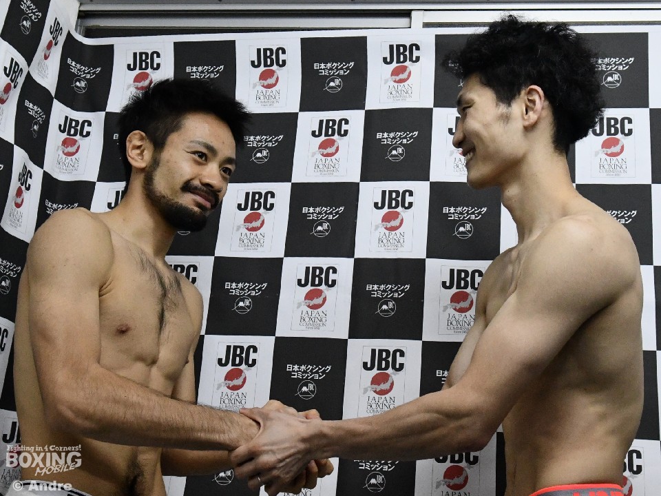 東洋太平洋バンタム級王座決定戦に出場する同級3位の栗原慶太(一力)と同級6位のストロング小林佑樹(六島)が23日、大阪市内の日本ボクシングコミッション関西事務局で前日計量に臨んだ。初対面の両者は明日の健闘を誓い固い握手を交わした。