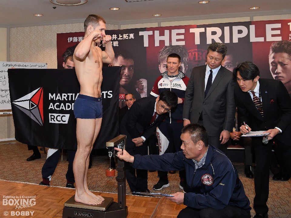 伊藤は、「これから少しずつ水分を採って1〜2時間後にお粥を食べ、夜は家族と鰻を食べます」とコメント。試合当日は6kg体重を戻しリングに上がる。相手と睨みあった伊藤は、「フェイスオフで目を見てこない選手がいるが、(チュプラコフは)見てきたので気持ちが入っているなと思った。相手陣営も良い人ばかりなので気持ちの良い試合になると思う」と好試合を約束した。