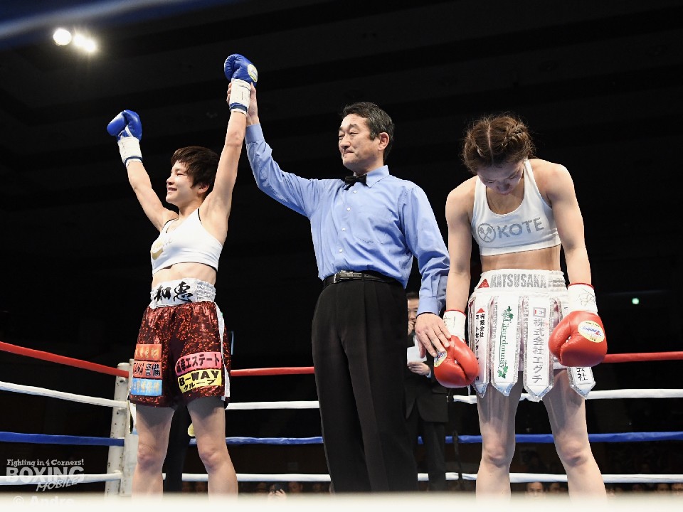 試合は、日向野の積極策が功を奏した。開始から前に出る日向野に対して、足を使いワンツーで対応した成田だが、中盤になると日向野の前進に捕まり手数で圧倒される。日向野は全ラウンド下がることなく攻め続け判定勝利を収めた。