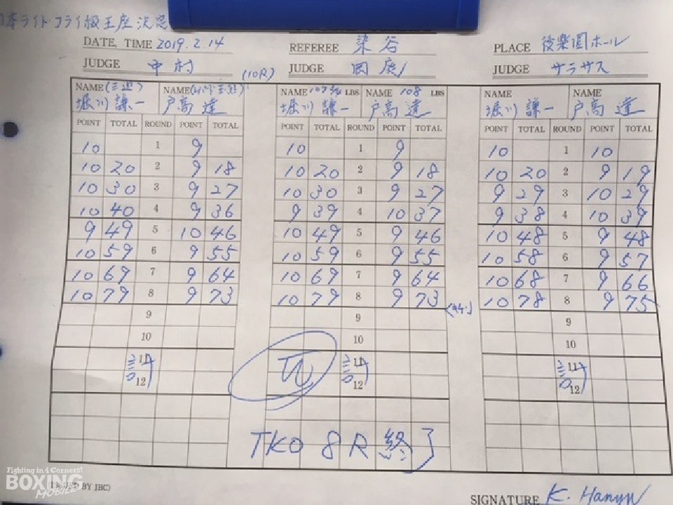 ジリジリ距離を詰める戸高に対し、堀川は右で迎え撃ち出方を伺う。すると堀川は巧みなデイフェンスで被弾を回避し、単発の左ボディを叩く老獪なボクシングを披露。戸高も3回は積極的な姿勢を崩さず打ち合いに持ち込むと右フックをヒットした。しかし、堀川は冷静な試合運びで着実にポイントを加点。前半終了時の公開採点は48-48×1、49-46×2で堀川がリードした。果敢に前に出る戸高だが、堀川は的を絞らせず左右アッパーを浴びせた。8回、堀川が左フックで効かせると連打で攻勢。このラウンドの乗り切った戸高だが、右目に異常をきたすとセコンドが棄権の意思を示した。