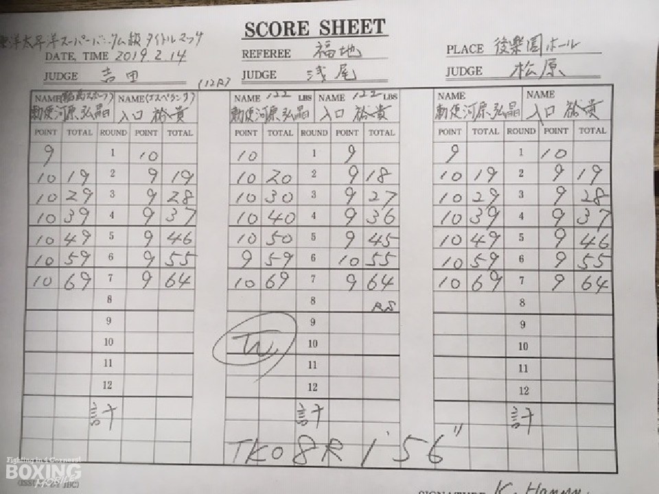 ペースを握られた勅使河原だが、2回になるとジャブから右ストレートで膝を揺らし流れを引き戻した。勅使河原はスピードの差を見せて多彩な左で鼻血を流させ、4ラウンド終了時の公開採点で39-37×2、40-36×1とリード。その後も左を軸に着実にダメージを与えた。入口は単発の右を決めるも劣勢を挽回するまでには至らず。8回、勅使河原はワンツー、左フックでふらつかせると、力なく後退した入口を攻め立てレフェリーストップに持ち込んだ。