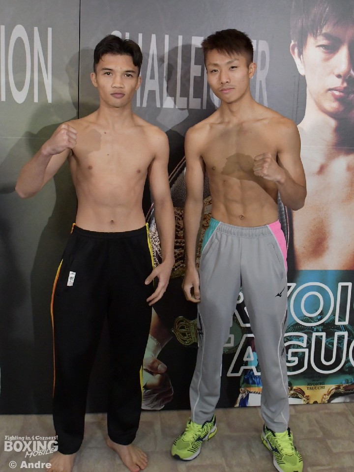ここまで7戦全勝(7KO)の畑中はリミットちょうどの50.8kgでクリア。今回から元OPBF東洋太平洋スーパーフライ級王者の石原英康氏とコンビを組む畑中は、「石原先生とコンビを組んで初戦なのでしっかりとKOで勝ちます。応援よろしくお願いします」と拳を握った。一方のソンセンは800gアンダーの50.0kgで計量を終えた。
