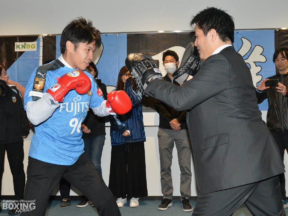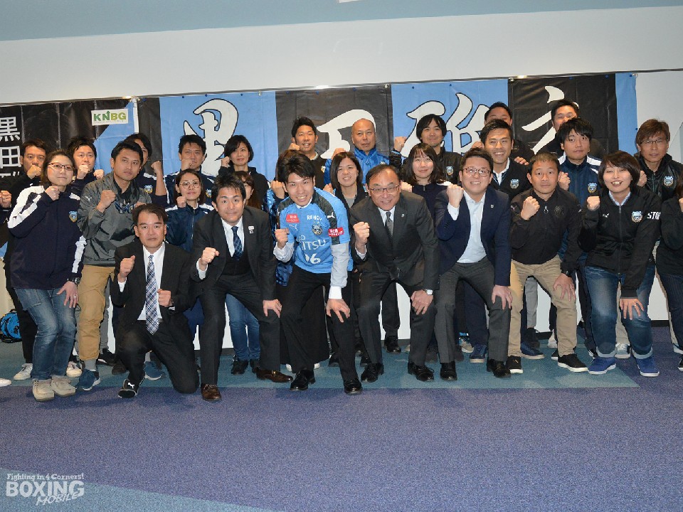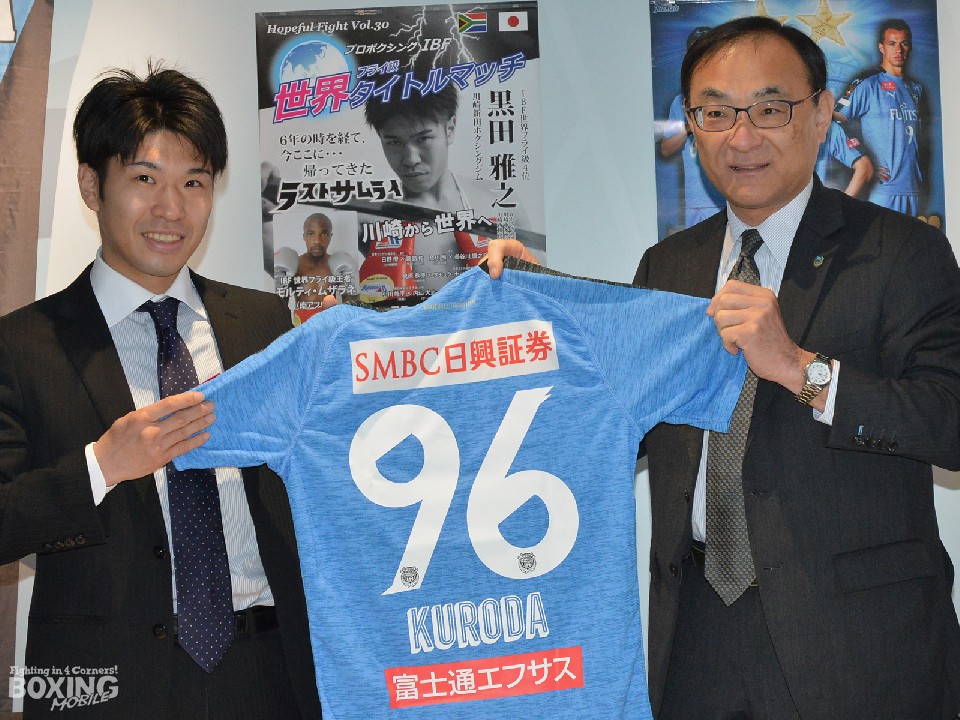 藁科社長は「クラブ全体で応援している。ウチとコラボの垂れ幕を作り応援に行く」とサポートを約束し、96(クロ)の番号が入ったユニフォームを贈ると、黒田は「市民とフロンターレの応援が力になっている。今度は世界のベルトを持って挨拶に来ます」と感謝した。