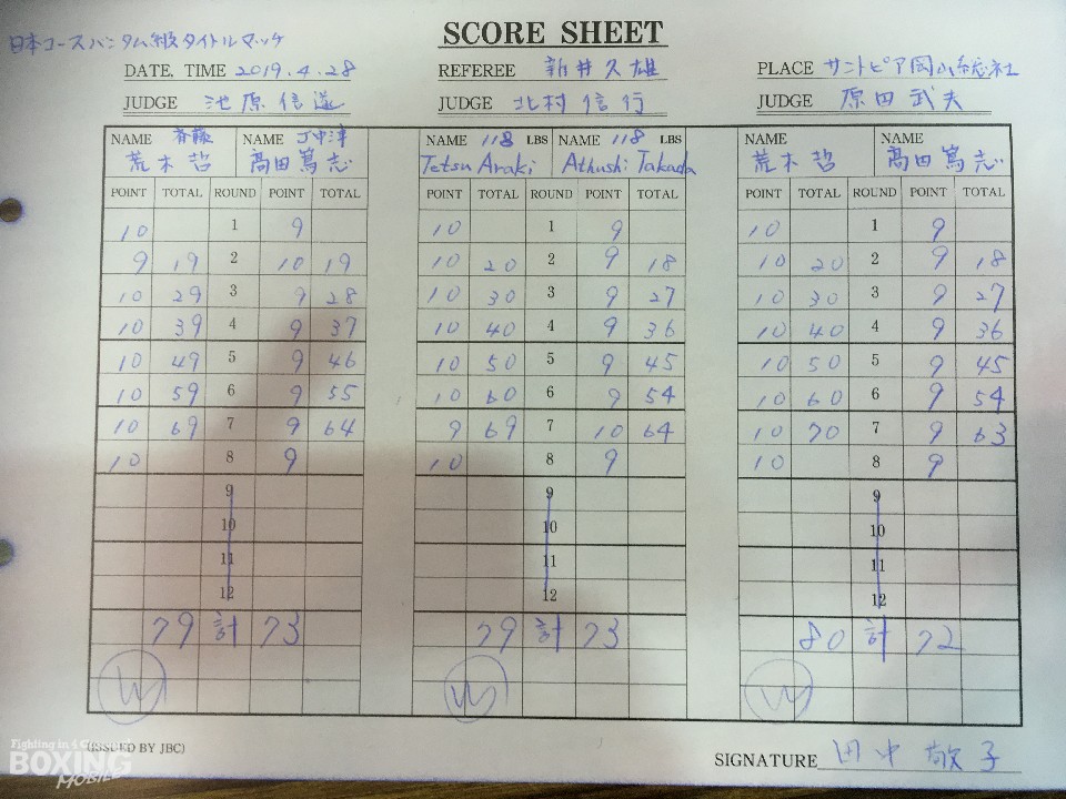 岡山の若きテクニシャン荒木が実力をいかんなく発揮した。序盤からサウスポー高田のパンチを見切った荒木は右ボディストレートをヒットすると、ガードを固めて前に出てくる高田に対し、アウトボクシングでポイントを加点。上下にパンチを散らしジャッジに攻勢をアピールすると、最終8回は激しい打ち合いで会場を沸かせた。荒木が大差判定勝ちで初防衛に成功した。