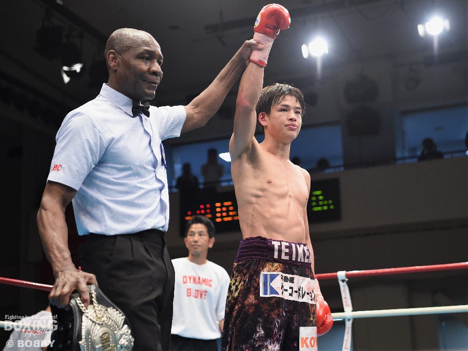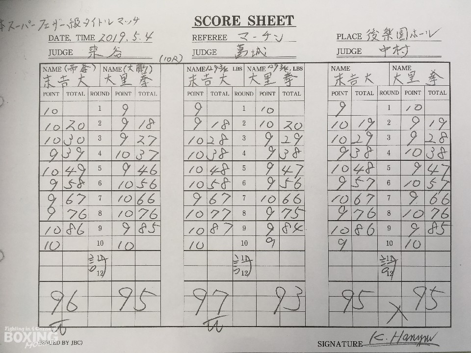 ジャブの差し合いからスタートした試合は、大里が相手のパンチによく反応して左を突き刺し先制。2回以降は中間距離で激しいペースを争いを繰り広げ、採点の難しいラウンドが続いた。前半終了時の公開採点は48-47×2、49-46×1で末吉がリード。6回、大里はプレスをかけてワンツーをヒットするが、末吉も負けじと右フックを好打。7回、大里は左ボディで動きを止めるとワンツー連打で攻勢をかけたが9回、末吉は右フックを叩きつけて腰を沈めさせると、左右をまとめて見栄えの良さをアピールした。最終10回は、大里が積極的な攻撃を仕掛けると、末吉も右を繰り出し譲らず。ジャッジ1者はドローとしたが残りの2者は末吉を支持した。