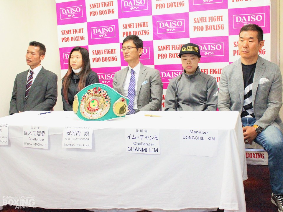 計量前に調印式とグローブチェック、質疑応答が行われ、廣本は日本製の赤色、イムは日本製の青色のグローブを選択した。初のタイトル戦となる廣本は、「広島でタイトルマッチができる貴重なチャンス。必ず勝ってジムにベルトを持ち帰る」と必勝を誓った。