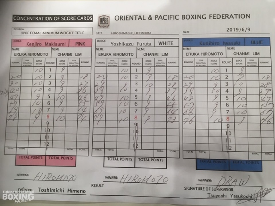 序盤からサウスポー廣本がスピードを活かした攻撃を披露。左カウンター、右フックでダメージを与えるとイムの返しのパンチを冷静に見切った。前半終了時の公開採点でリードした廣本だったが、イムに距離を詰められボディ攻撃を受けて失速。コーナーに詰められ右フックを浴びた。しかし、廣本は強気に打ち返すと、最終8回にはワンツー右フックで粘るイムを突き離した。