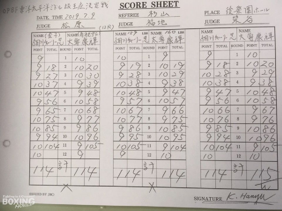 ボディへ右ストレートを伸ばす細川に対し、サウスポー太尊は前の手で距離を測りながら左ストレートを迎え撃つ展開。接近戦を仕掛ける細川だが、太尊の懐の深さに苦労した。4回、細川は強引に距離を詰めてボディで連打で攻勢。しかし、太尊は左アッパーで顔を弾くと右ボディを決めて対抗した。4ラウンド終了時の公開採点は、39-37×1で太尊、38-38×2でイーブン。中盤は太尊の左カウンターが冴えわたり見栄えの良さをアピールしたが、細川も8回は飛び込んでのワンツーで顔をのけぞらせ反撃した。8回終了時は77-75(太尊)、77-75(細川)、76-76でドローと三者三様。9回、細川の右フックを皮切りに総力戦に突入。互いに譲らず採点の難しいラウンドが続いた。12回、細川がワンツーを決めれば太尊も左アッパーを突き上げ会場を盛り上げた。ジャッジに委ねられた採点は1者は太尊としたが残りの2者は引き分けで決着がつかなかった。