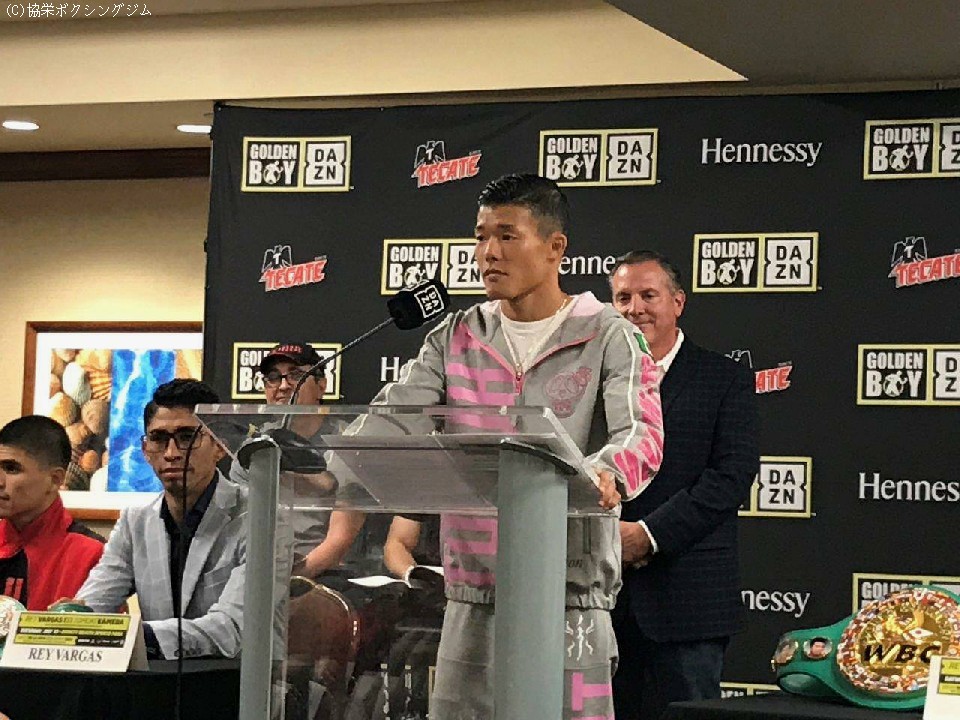 亀田は集まったメディアを前に「アメリカの地で、更にアメリカ人とメキシコ人の多いロサンゼルスで試合が出来る事に、スーパーわくわくしています!特にこの4カ月の厳しい練習と調整で、この上ないくらいコンディションはいい状態に準備できています」とスペイン語で堂々と挨拶。