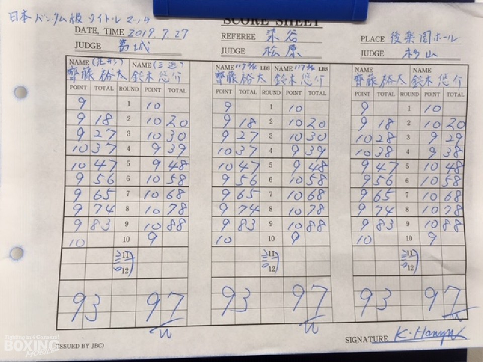 サウスポー鈴木が初回から左ストレート、右フックを好打。相手のパンチをサイドステップで回避し、上々の立ち上がりを見せた。2回も鈴木が的を絞らせず的確なパンチで攻勢。守勢を強いられていた齊藤だが4回に右フックが決め、鈴木の腰をガクッと沈めさせ、連打で反撃に転じた。5回、接近戦で細かいパンチをぶつけ合い、齊藤の左右のショートアッパーがヒットしたが、前半終了時の公開採点は3者ともに48-47で鈴木がリードした。激しい応酬のなか、齊藤は偶然のバッティング右目上をカットし、鈴木は左目上を腫らした。7回、鈴木は再びジャブで距離を取ると左ストレートをヒットし見栄えの良さをアピール。9回はロープに詰めて連打で仕留めにかかったが、齊藤もガードでしのぎ王者の意地を見せた。逆転を狙う齊藤は10回、最後の力を振り絞って手数を出すが、鈴木は最後まで踏みとどまり、97-93×3で新チャンピオンに就いた。