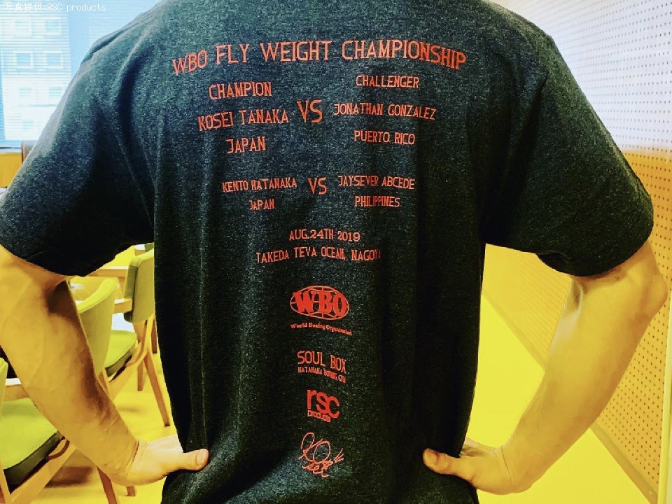 ボクシングアパレルブランドRSCproductsが8月24日(土)に名古屋市内の武田テバオーシャンアリーナで防衛戦を行うWBO世界フライ級王者の田中恒成(畑中)のV2戦応援Tシャツを作成し販売すると発表した。