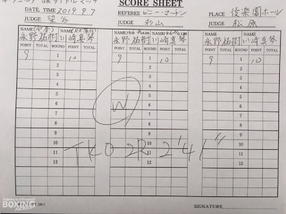 一方、肩を落として控室に戻った川崎は最後のストップについて、「確かに防戦一方で危なく見えたかもしれないが、打ち疲れを誘おうとしっかりとブロックをしていたので気持に余裕はあった。あの場面はロープダウンでもよかったはず」と抗議し、「思っていたよりやりやすく、イケると感じていただけに残念。対策してきたことの1/10も出せていない」と悔しがった。