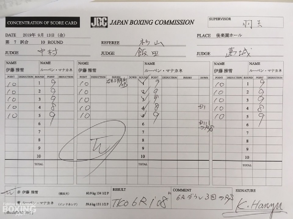 ライト級での再出発を目指す伊藤は、一回り小さいマナカネに丁寧に左ジャブを突き、早々に距離を掴むと右ボディストレート、左ボディとインドネシア人の腹を攻め立てた。マナカネもブロックを崩さず、伊藤の打ち終わりに左フックを返すが、踏み込んだところで頭が伊藤の右目上に当たり、伊藤は片側の視界を失った。2回以降は距離感を失った伊藤がマナカネの左オーバーハンドに苦戦したが、右アッパー、打ち下ろしの右ストレートを打ち込み続けると3回終盤にラッシュをかけ、続く4回にダウンを奪った。マナカネもしぶとく追い上げを図ったが、6回にアッパー、ストレートとダブルで右を打ち込まれ2度目のダウン。最後は伊藤の渾身の右ストレートでキャンバスに沈んだ。