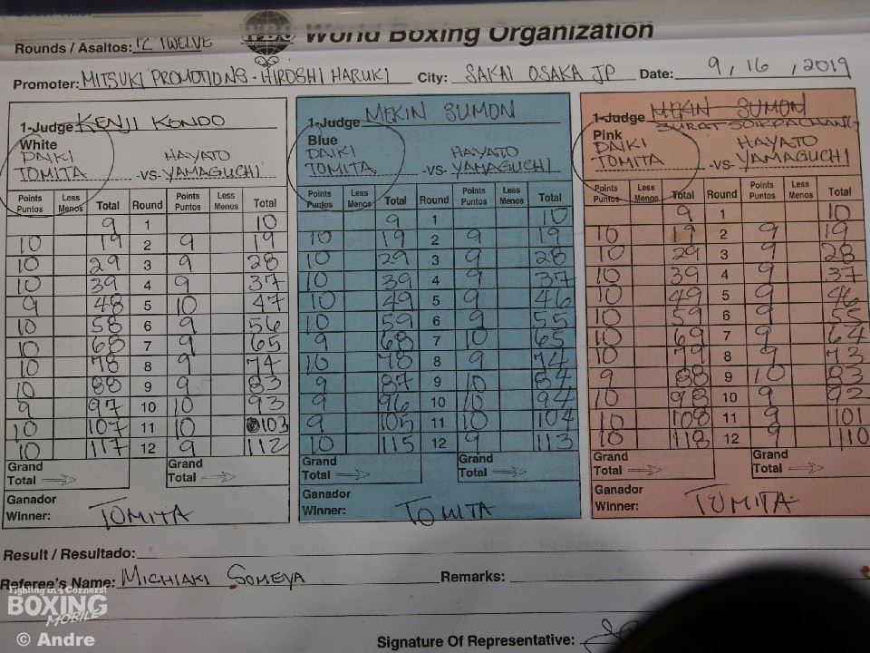 4度目の挑戦でタイトル獲得に燃える山口は、積極的に前に出て左右のフックを振った。対し、序盤に硬さが見えた冨田は冷静に距離を見極めると右ストレートから左フックへとつなげペースを握った。ヒットは富田が上回るが、山口も前進を止めずタイトル戦にふさわしい打ち合いに。最終ラウンドまで決定打は生まれなかったが、判定勝ちで冨田が初のタイトルを獲得した。