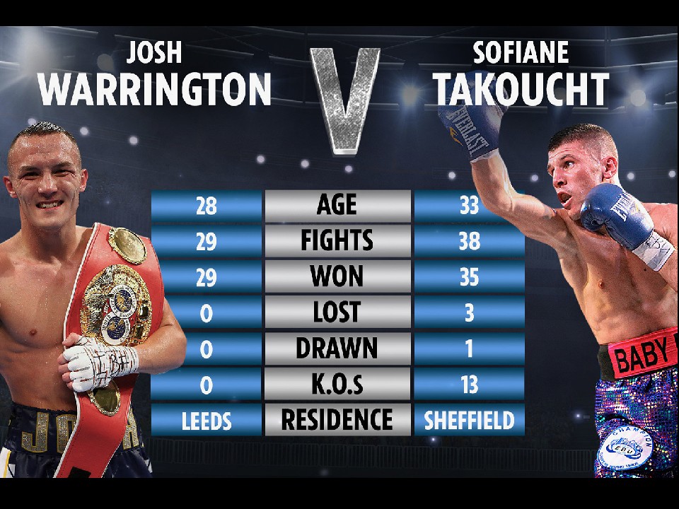 英国・リーズのファースト・ダイレクト・アリーナで12日(日本時間13日)に開催されるIBF(国際ボクシング連盟)フェザー級タイトルマッチ。王者ジョシュ・ウォーリントン(英)と、同級4位の挑戦者ソフィアン・タクシュト(フランス)の前日計量が、同地で行われた。王者ウォーリントンが2戦連続、地元での3度目の防衛を目指すため秤に望んだ。