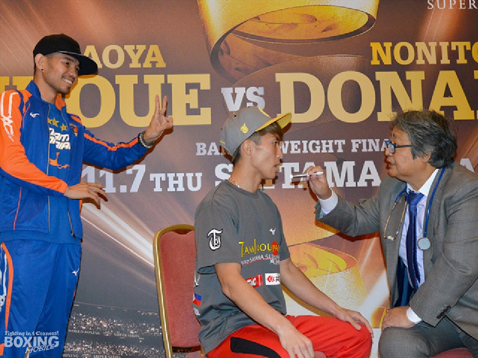 WBSS(ワールド・ボクシング・スーパー・シリーズ)バンタム級決勝戦を3日後に控えたWBA(世界ボクシング協会)、IBF(国際ボクシング連盟)バンタム級王者の井上尚弥(26=大橋)とWBA世界同級スーパー王者のノニト・ドネア(36=比/米)が4日、都内のホテルで予備検診に臨んだ。8月26日の発表会見以来、70日ぶりに顔を合わせた井上は、「(減量をしているので)お互いフォルムは小さいと思ったが、イメージは変わらない」と相手の印象を口にした。