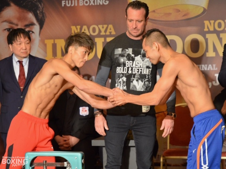 WBSS(ワールド・ボクシング・スーパー・シリーズ)バンタム級決勝戦、WBA(世界ボクシング協会)、IBF(国際ボクシング連盟)バンタム級王者の井上尚弥(26=大橋)対WBA世界同級スーパー王者のノニト・ドネア(36=比/米)の前日計量が6日、都内のホテルで行われた。井上はリミットちょうどの53.5kg、ドネアは200gアンダーの53.3kgでクリアした。計量後には23秒のフェイスオフでお互い視線を外さなかった。