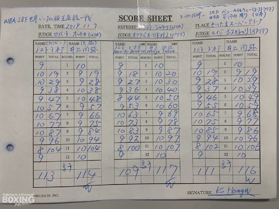 ドネアの左フックで目の上をカットした尚弥はデビュー以来、初めての出血。会場がどよめいた。中盤に入っても高度な駆け引きから距離を探り合い、ドネアが伝家の宝刀、左フックを振り抜けば、モンスターは右ストレートを見舞って超満員の会場を興奮へと導いた。勝負を決定づけたのは11ラウンド。尚弥の左がドネアのボディをとらえた。それでもカウント9で立ち上がったドネアは、最終ラウンドまで日本の若武者を相手に集中力を切らすことはなかった。判定結果は3-0(116-111,117-109.114-113)。