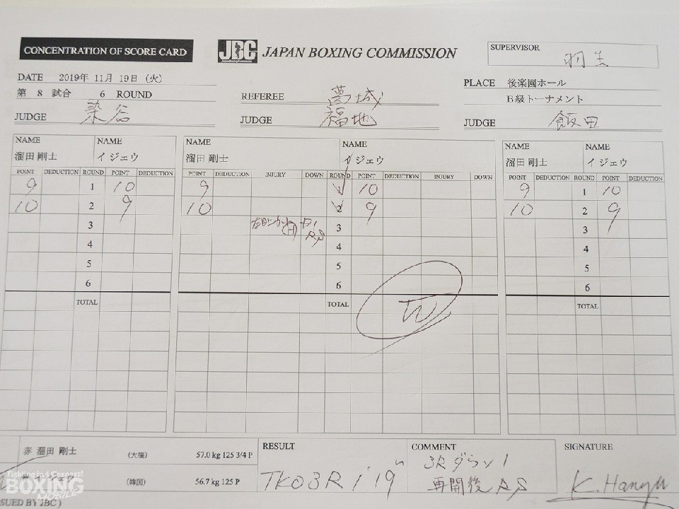 開幕戦は日本フェザー級6位の溜田剛士(26=大橋)と韓国KBM同級王者のイ・ジェウ(26=韓国)が激突。溜田が左右フックで攻め込んだが、イはインサイドから左右アッパーを痛打。2回は溜田がイをロープに詰めて連打を繰り出すが、イも粘りを見せた。すると3回、イの勢いは止まらず、回転力を活かした連打で襲いかかると左フックでダウンを先取。立ち上がった溜田を冷静に仕留めた。