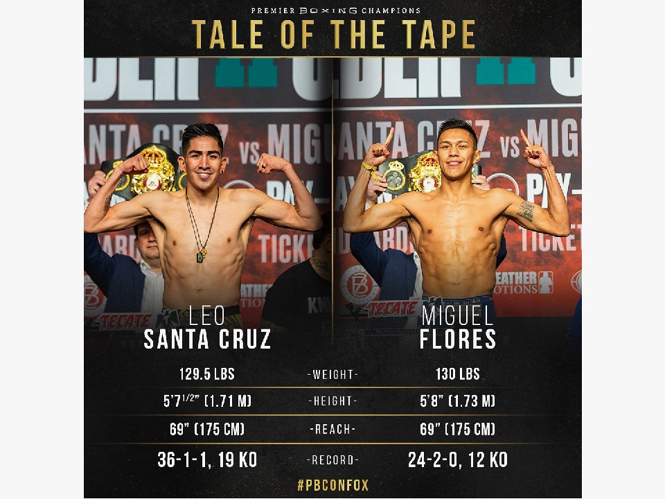 WBA世界スーパーフェザー級スーパー王座決定戦は、同級リミット58.9kgをサンタクルスは100g少ない58.7kgで合格。フローレスはリミットの58.9kgでクリアした。WBA世界スーパーフェザー級正規王者には同日、別会場の米国・カリフォルニアで2度目の防衛戦を行うアンドリュー・カンシオ(米)が君臨している。