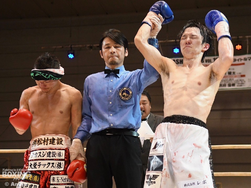 次なるステージを目指す奥本と、王座返り咲きを狙う中川のサウスポー同士の一戦は、独特のリズムで飛び込み左ストレートを当てた挑戦者が5回までの途中採点でリード。6回に入ると中川の左オーバーハンドからの右ボディが連続で決まるが、奥本もプレスを強め、中川をロープに詰めてはジャブから左右フックで挽回を図った。しかし、決定打は生まれず、終始足を使った中川がテクニカルなボクシングでポイントを重ね、最大7ポイント差で判定勝ち。敵地で王座返り咲きを果たした。