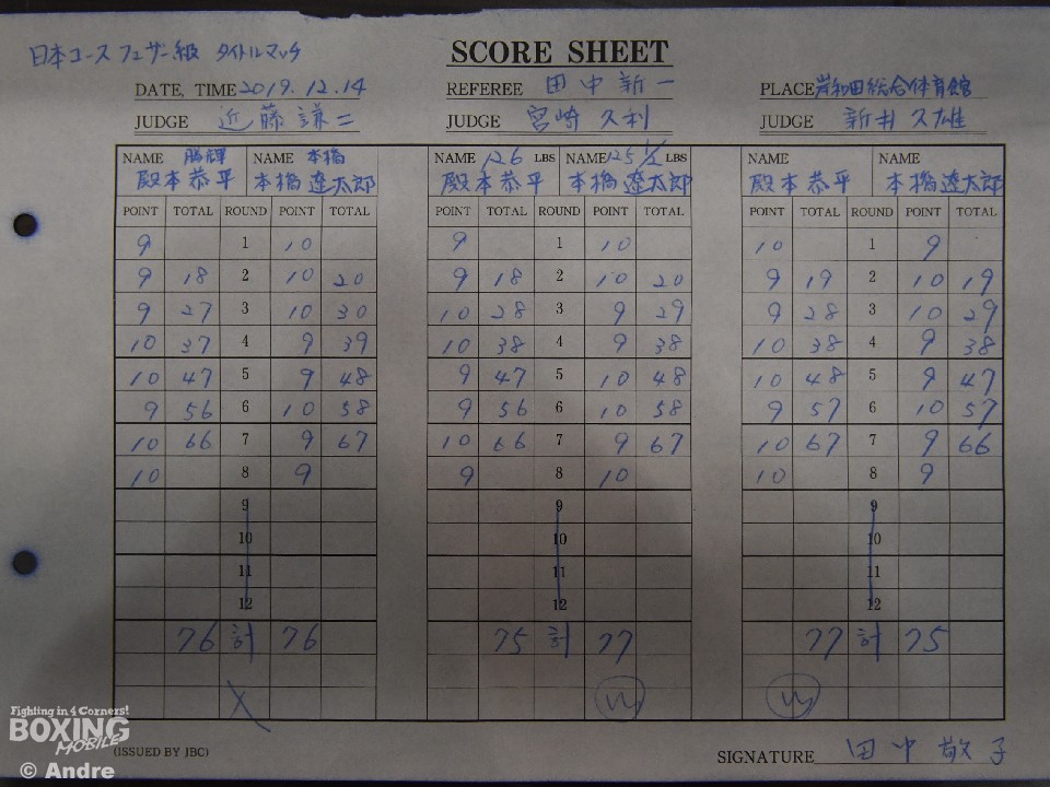 試合は、一進一退の攻防を見せた両者が死力を尽くして打ち合ったがドロー判定となった。序盤、前進を強めた本橋が左右のフックを決めると、殿本は後手に回った。中盤、ジャブ主体の組み立てに変更した殿本がペースを奪い返すと本橋はたまらずクリンチを多用することとなった。最終ラウンド、渾身の打ち合いを演じた両者だったが判定は3者3様の引き分け。殿本のドロー防衛となった。