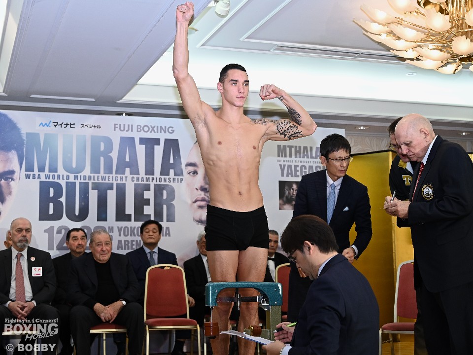 続けて世界初挑戦のバトラーは表情を変えずに計量を行い、リミットの72.5kgでクリアし右腕を高々と上げた。その後、22秒間のフェイスオフでは2人とも視線を外さなかった。