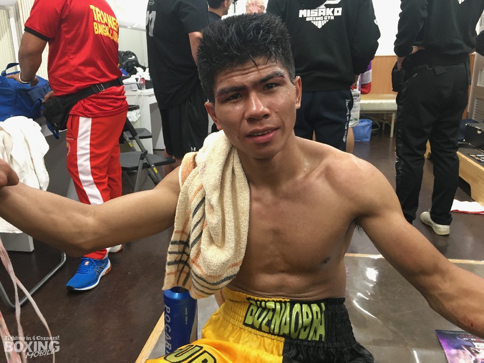 比嘉の復帰戦の相手を務めたブエナオブラは開口一番「ベリーストロング!」と苦笑いした。それでも、元チャンピオンと対峙した感想を問われると「フライ級の時よりスピードは感じなかった。アッパーカットが良かったが、2階級上げてきたのでパンチ力はまあまあだった」と振り返った。1ヶ月のトレーニングで右カウンターを練習してたというブエナオブラは今回がプロ初ダウン。もちろん初のKO負けだが、超満員の後楽園ホールは気に入ったようで「また日本で試合がしたい」と笑顔で会見を終えた。