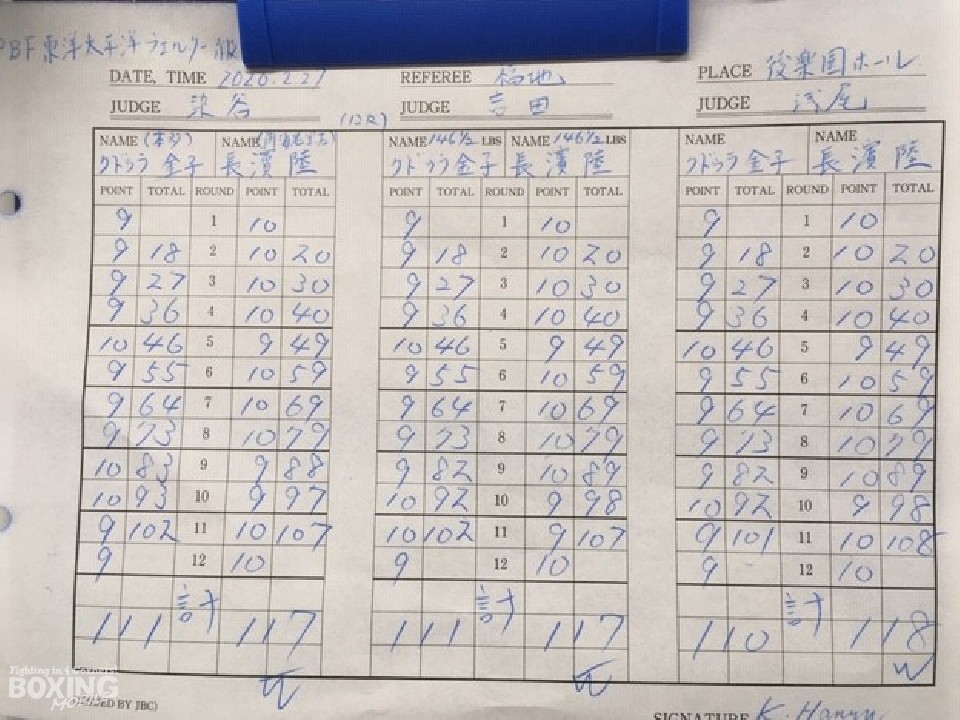 ボディを丁寧に攻めた長濱が新鋭クドゥラ金子のパワーに屈せず序盤からポイントを稼いだ。ボクモバ勝ち予想では劣勢だった長濱は10ラウンド、クドゥラの怒涛の攻撃をクリンチでしのぐと11ラウンドには意地のぶつかり合いにも付き合った。後楽園ホールのファンの大歓声を誘った長濱が大差判定決着で、OPBF東洋太平洋ウェルター級王座を獲得した。コロナウィルス騒動のため、この試合を最後にボクシングは1ヶ月のお休みとなる。