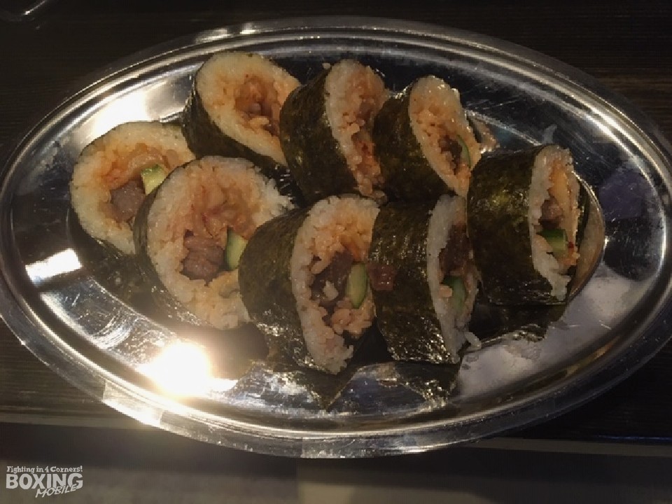 どうしてもご飯が欲しくなり、人気メニューの三島特製海苔巻きを注文。中にはライスときゅうりキムチモヤシそしてカルビ。ホルモンとの相性も抜群で甘くて大満足。一度食べるとやみつきになり、リピーターが多いというのも納得がいく。