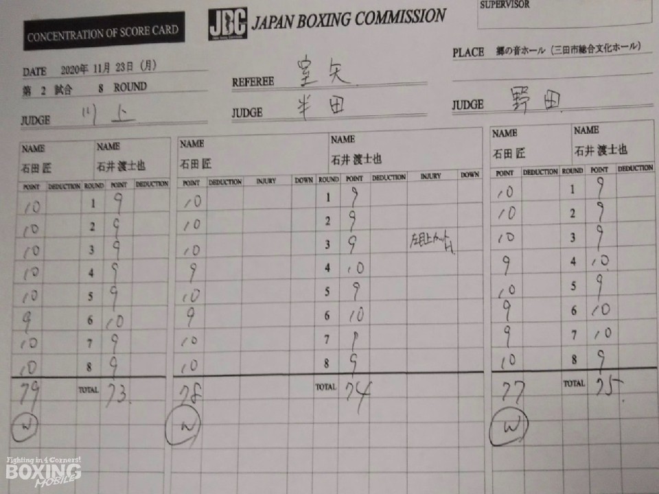 世界ランカーの石田がキャリアを見せた。石田は3回にワンツーで左まぶたを切り裂くと左を軸にポイントを加点。中盤、石井は左ボディを決めて反撃に転じたが、石田は決定打を避けて巧みな試合運びで勝利のゴールテープを切った。